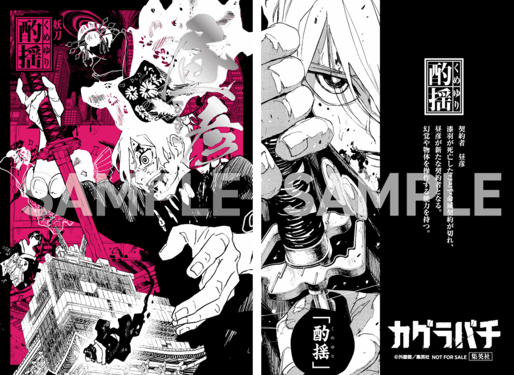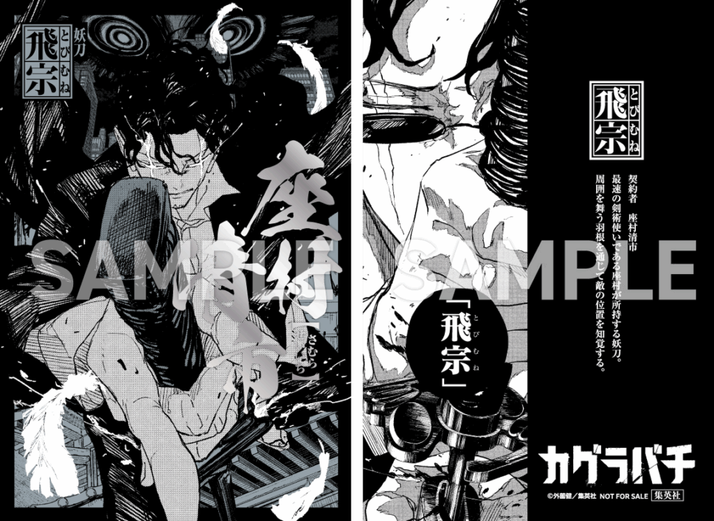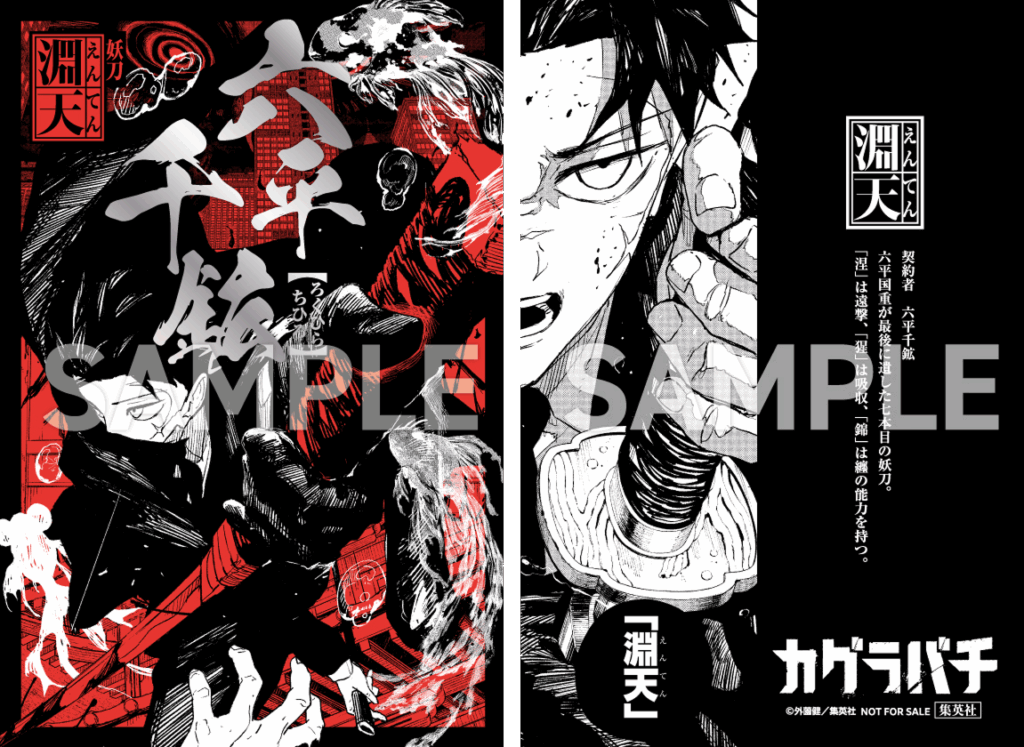 Additionally, the 45th issue of Weekly Shonen Jump (on sale October 6), celebrating the series’ 2nd anniversary, features a special talk between Takeru Hokazono and Kohei Horikoshi, including an exchange of illustrations with Horikoshi drawing Chihiro, the protagonist of “Kagurabachi”, and Hokazono drawing Deku, the protagonist of “My Hero Academia.” Horikoshi’s “Kagurabachi” Chihiro is teased on the Volume 9 book band!