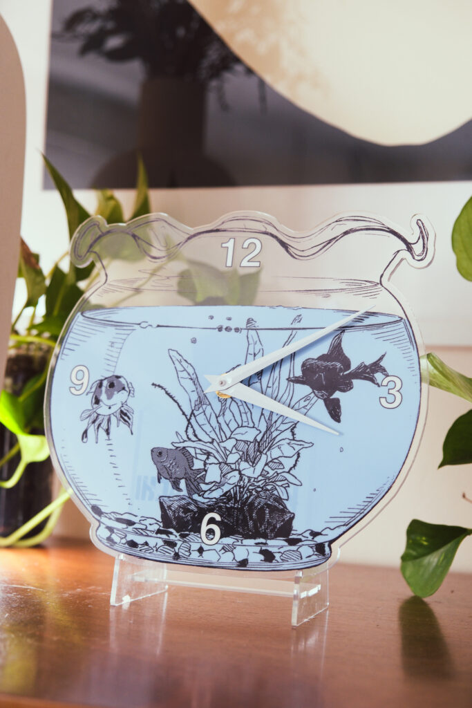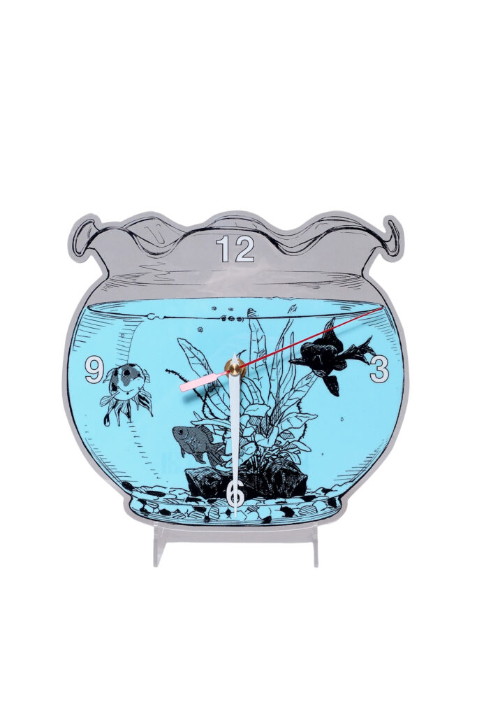 作品世界を象徴する金魚鉢モチーフの涼しげなアクリル時計。