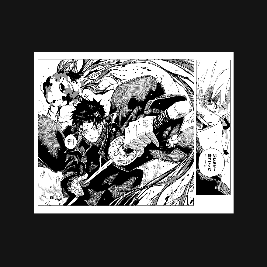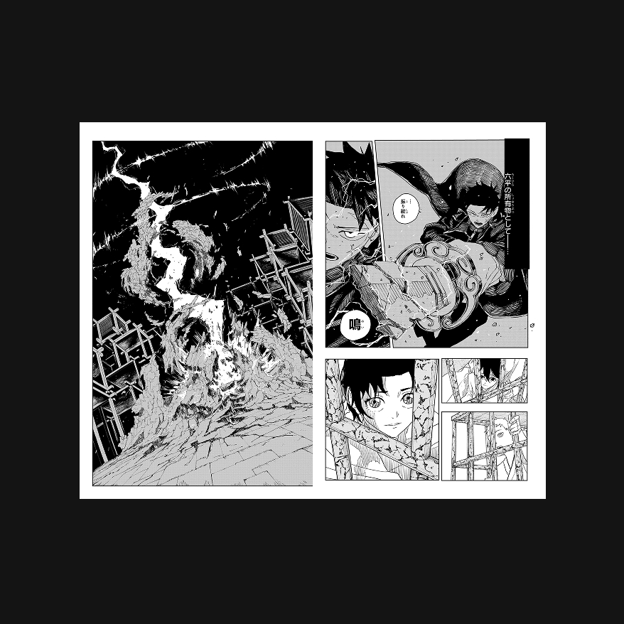 下書きでは「『刳雲』 お仕舞だ」となっていた千鉱のセリフが「六平の所有物として――… …振り絞れ 鳴」というセリフに。 また、「鳴」の雷撃が炸裂するページではあえてオノマトペが外され、文字は無いながらも轟音を感じさせるページに仕上がり、より静と動の演出が効果的に発揮されている。