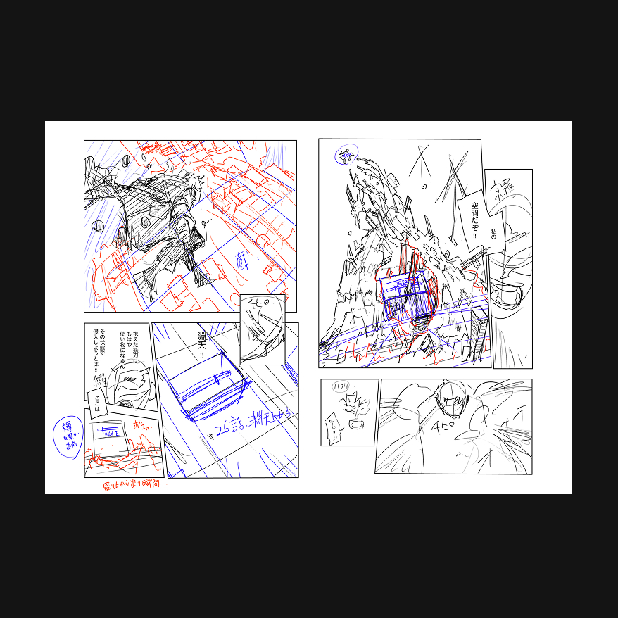 下書きで大まかに描かれていた異空間のディテールが細やかに描写された。また戦闘の合間に、千鉱の仲間である伯理のカットが差し込まれたことで、より戦闘状況が分かりやすくなっている。